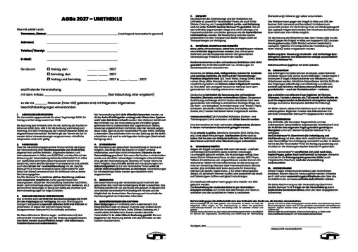 frei, bis er fix gebucht wird. Dazu benötigen wir die ausgefüllten und unterschriebenen AGBs und die Hinterlegung der Kaution in Höhe von 200€ (bzw. bei zwei Tagen 400€) in bar. Das kann am besten